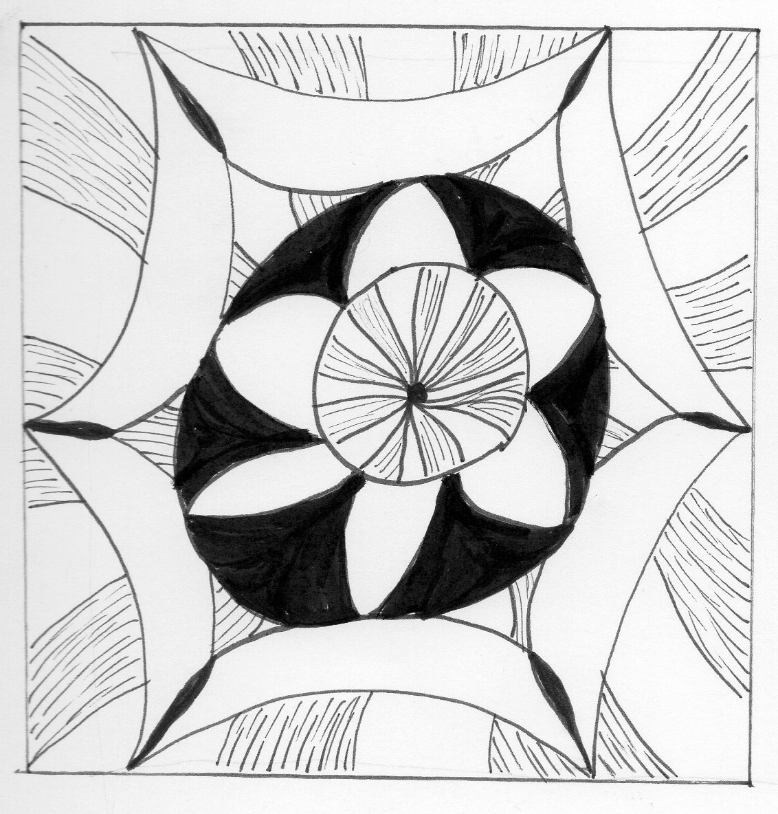 Most nights after I get in bed I grab my pen and drawing paper. I usually start with a zentangle and often fall asleep mid drawing only to wake up to see a big blob on the page. Still, I do manage to come up with a few finishes I like. I love doing them because they’re so zen – they obviously relax me! And they’re so for art’s sake. Yet I end up thinking that I’ll use them as a basis for another art medium…maybe soon.