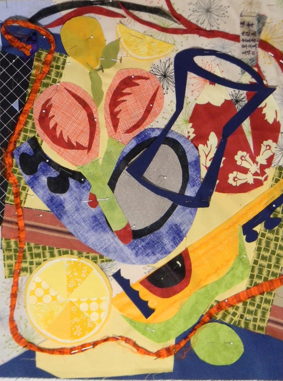 Now, here’s mine, a work in progress, not yet sewn together, compositionally flawed as it is (it’s a lesson, not a masterpiece!