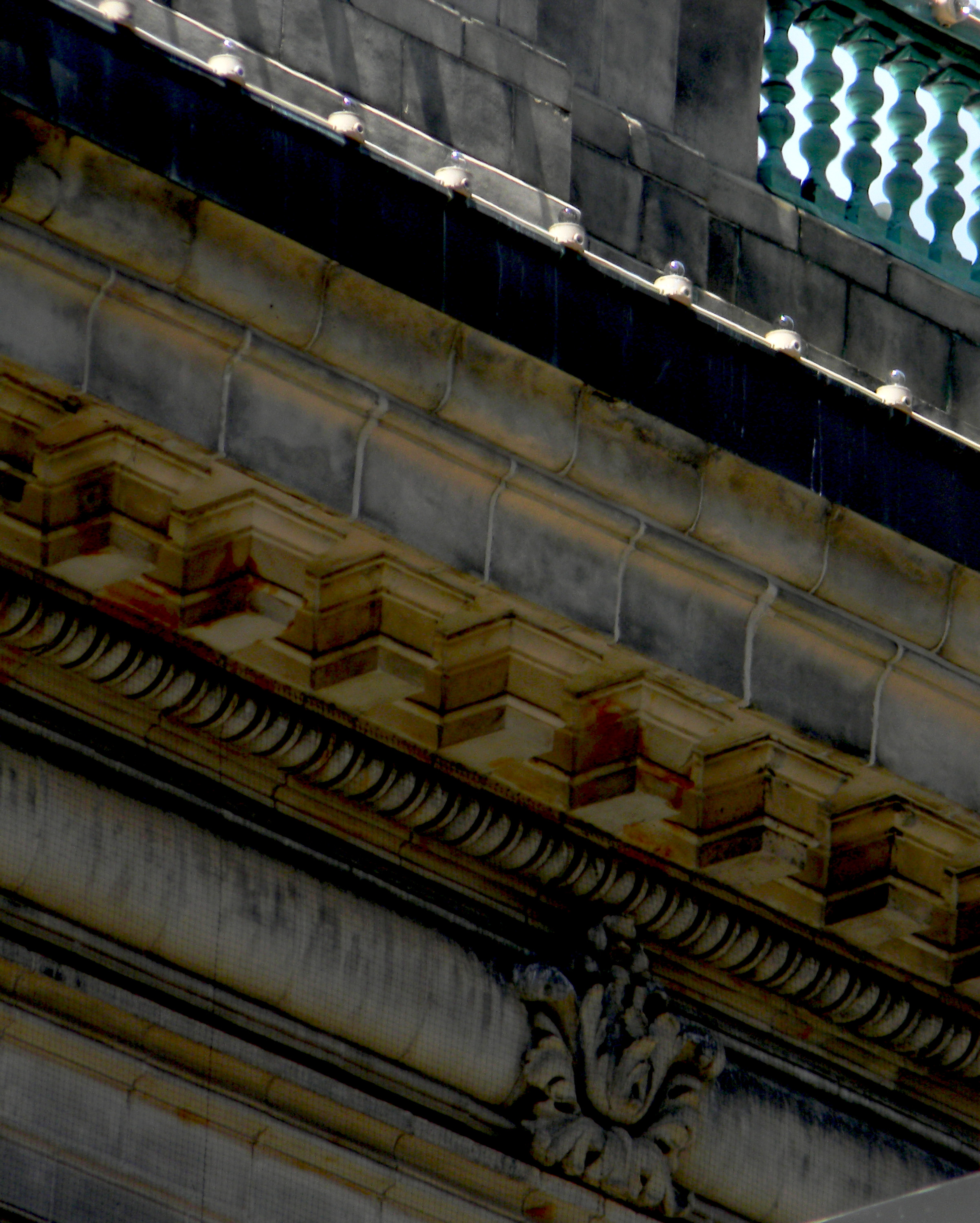 Peeking downward into the stairwell from the 12th floor.Just something appealing about this one, the rusted spout, the detailed stonework and the subtle play of brick and black.Such a rich architectural panoply in just one block, captured in just one corner of a building.