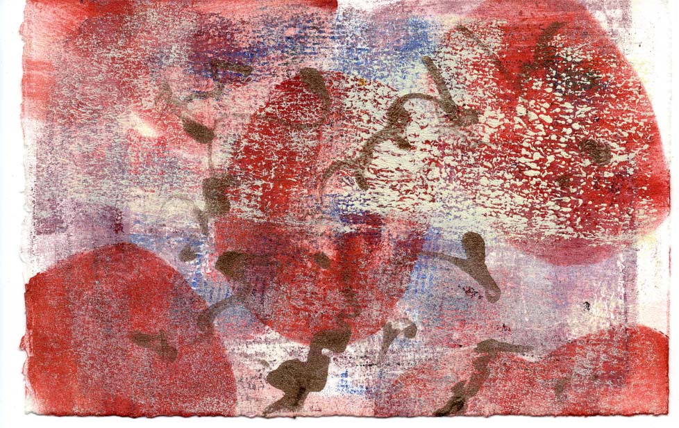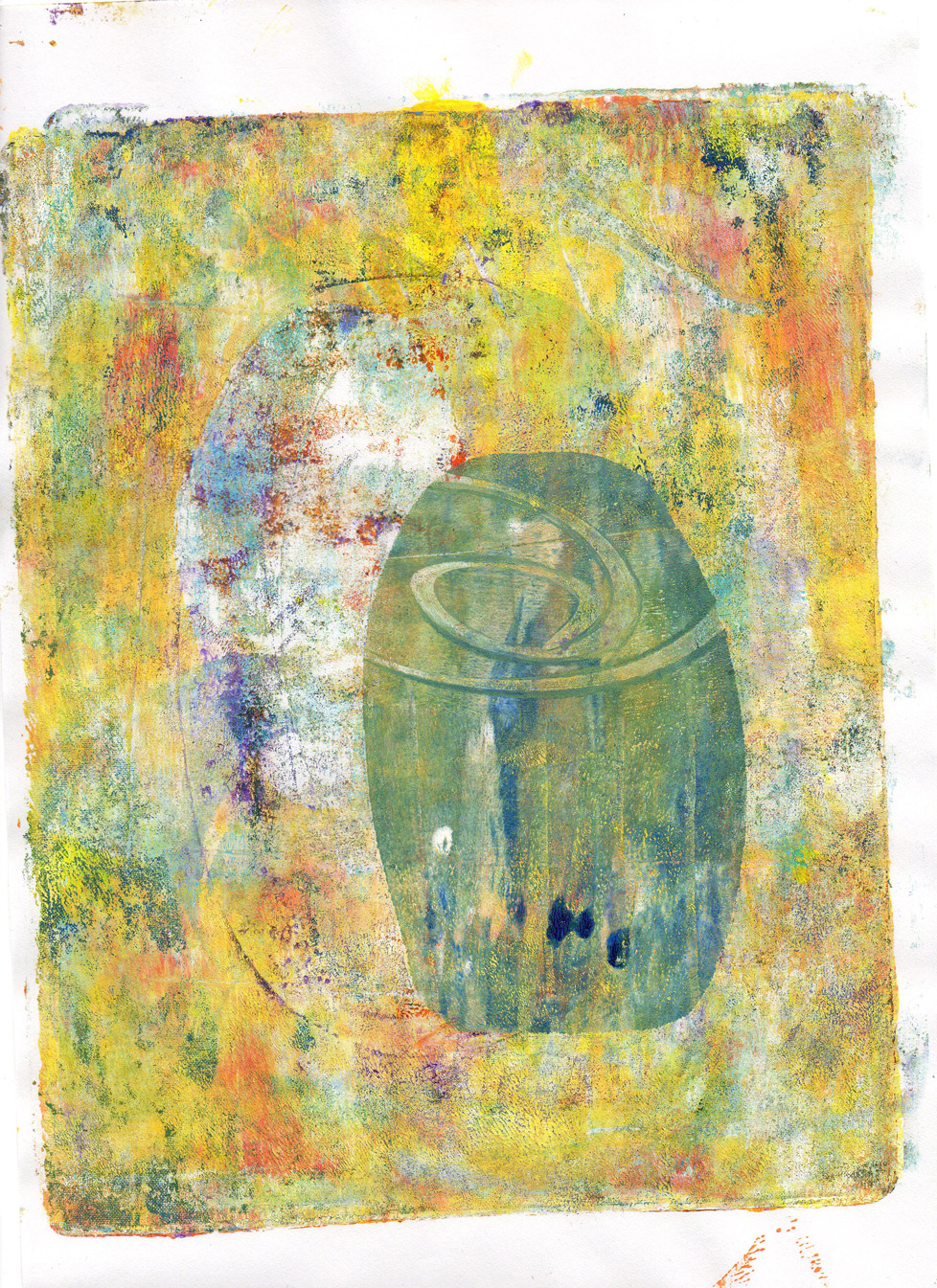 Then, I just read Jane Davis’ recent blog post on Collage Journeys and was very inspired by her gorgeous prints. My desire to follow up on these was rekindled by her shapes and I’m pretty pleased with how my new ones came out. These are on paper but I used Jaquard fabric paint. I thought I’d share some with you: