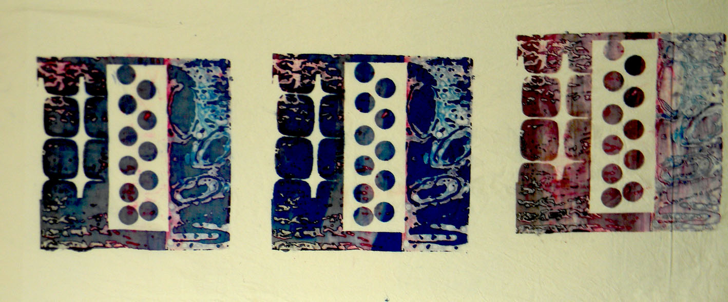 Diana’s tjanting waxed screen below left which also incorporates the center screen, and on the right, successive prints