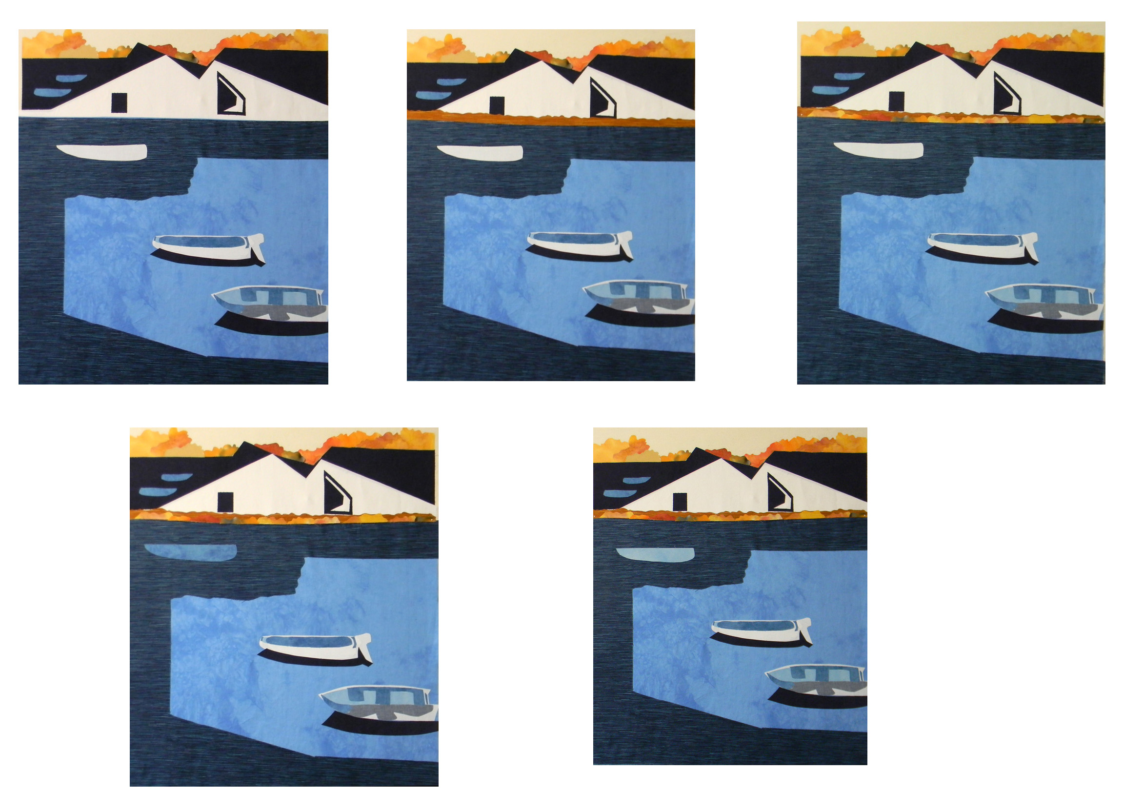 All those blues and value changes are very effective in creating a mood. I like the graphic nature of the piece with large and small scale things to keep the viewer engaged. Thanks for sharing your design evolution…it was worth the effort! Adding more detail and emphasis to the land really balanced out the 3 boats and the sea…