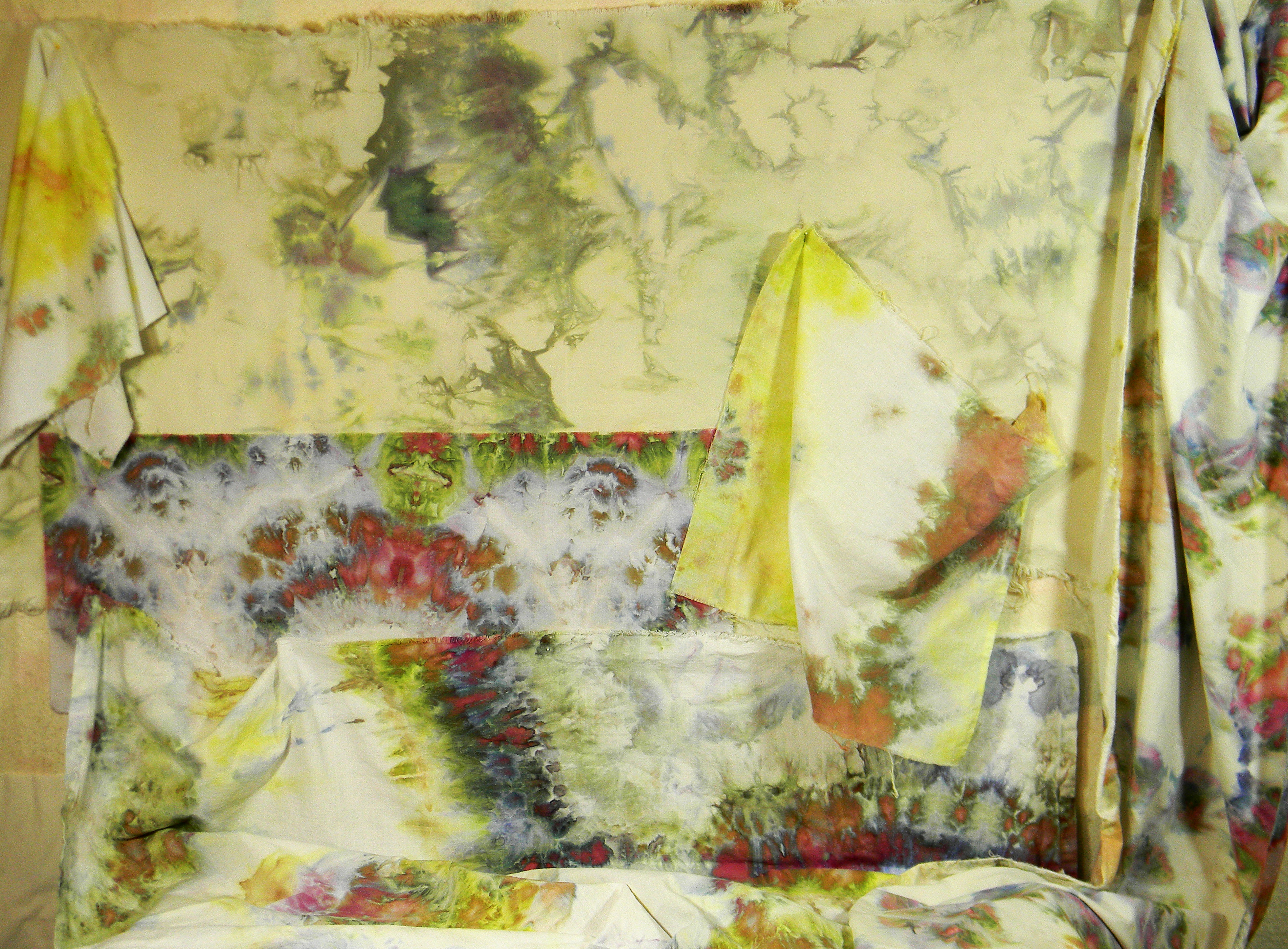 I used PRO MX REACTIVE DYES: Eccru, Lavender, Chartreuse and Chinese Red on a variety of fabrics that were left from the summer in a pile already soaked and dried with soda ash.