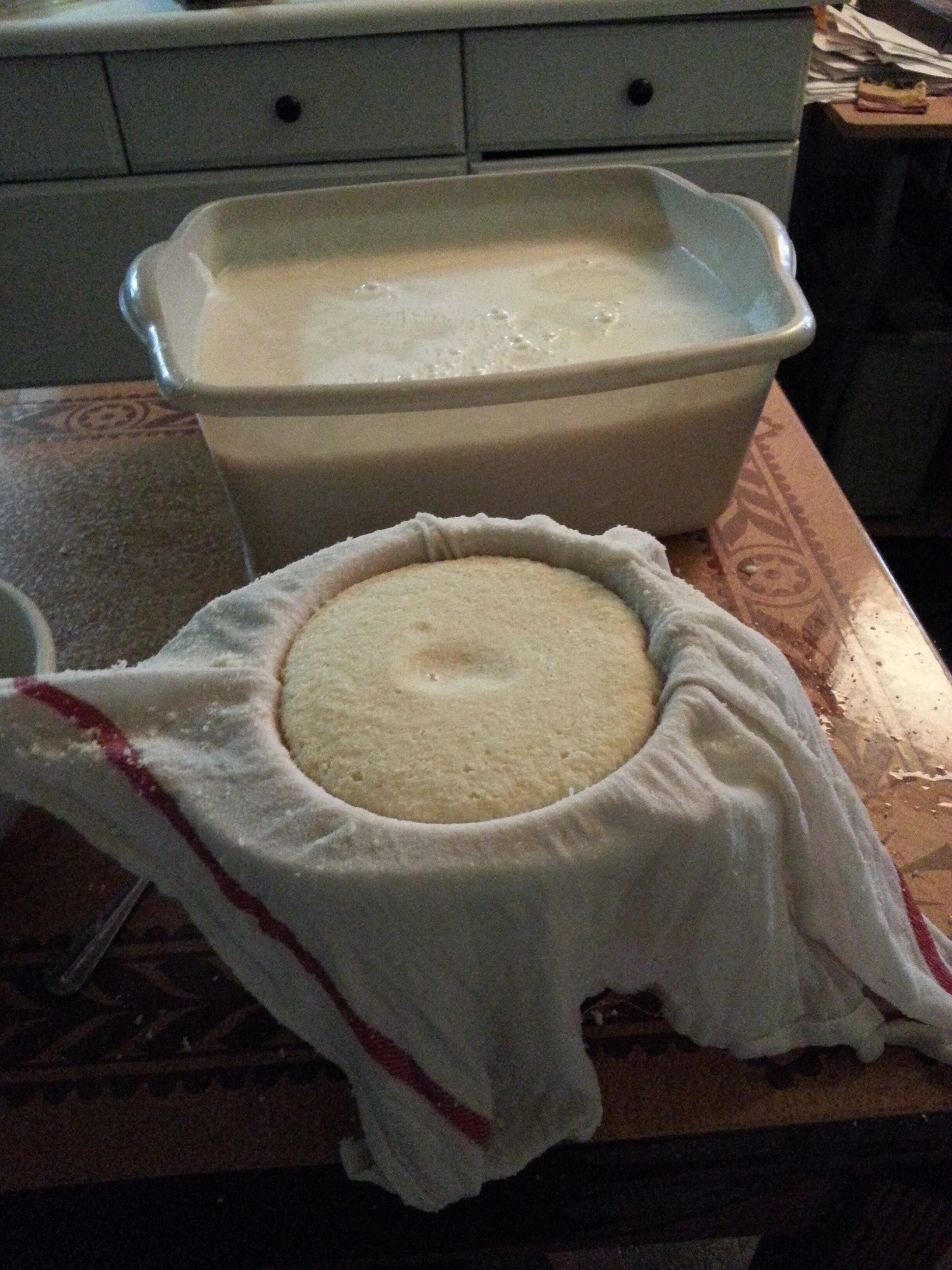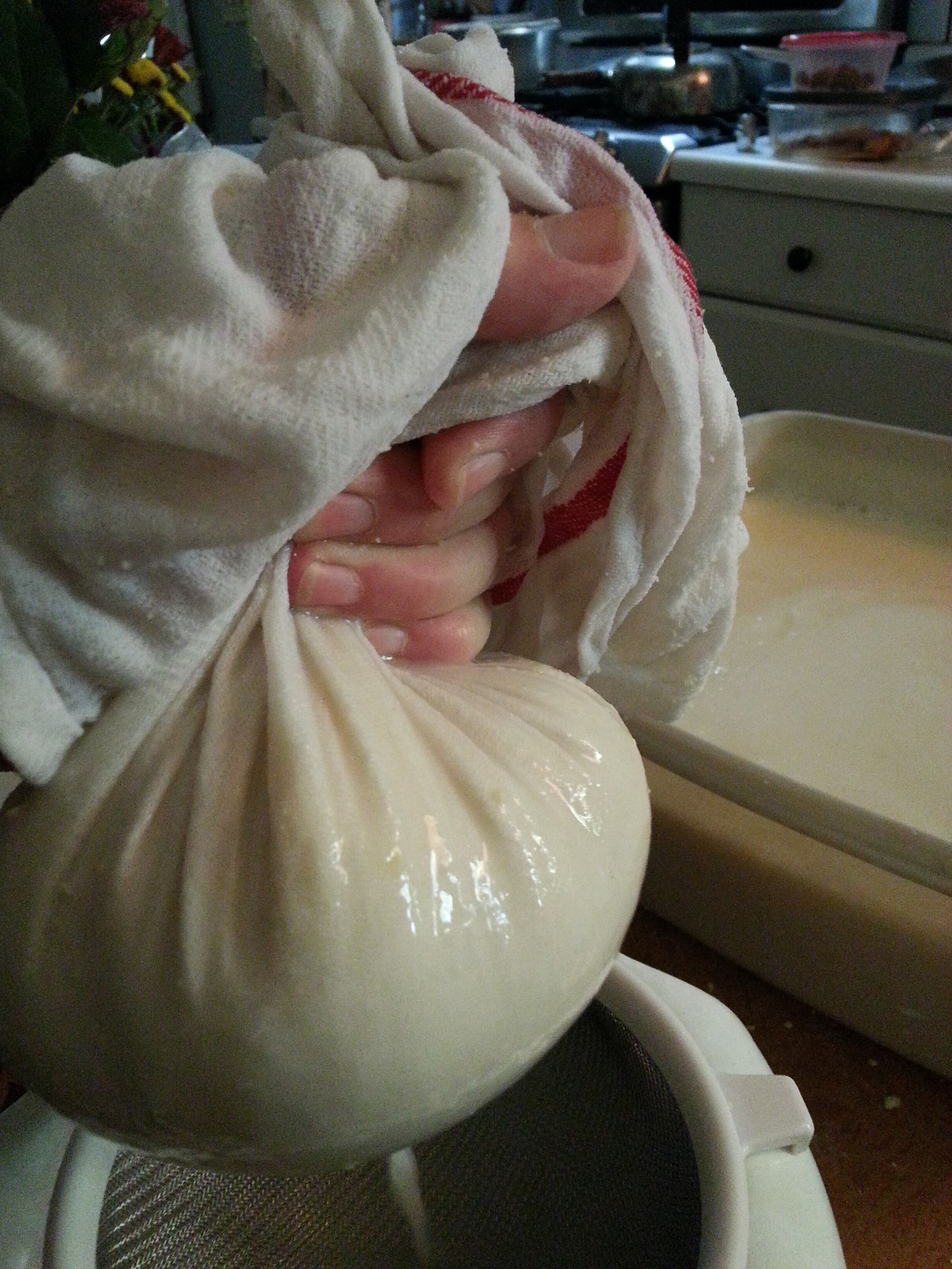 I started out with 1 1/2 package of dry soybeans (sorry, I’m not sure how many oz. in the package but probably 16 oz. or under). They sat covered with water in a pot overnight. In the morning I drained them and placed them, one cup at a time, in the food processor with one cup of water until they’re blended. Then I added another 2 cups (3 cups in all, or 4 if you’d like) of water to the mixture. If I put it all in the processor at once, it leaks out from the cover. Pour this into a strainer that is lined with a thin cotton dish towel.