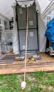 Yesterday, I thought I was done and rushed to shoot and upload what I thought would be the final piece. I wanted to take the picture outdoors and so I rigged something to hang it on by tipping my new folding table to stand upright on end but the table bends slightly in the middle. I applied a length of 1 x ? 16 or something to push it further frontward and it was functional but not quite straight up and down, There was still enough of a tilt to throw it slightly off.