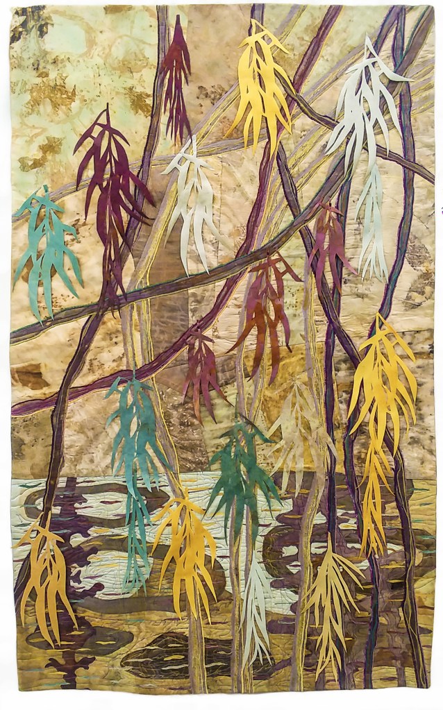 There was also a glaring spot that I wanted to cover but had forgotten about it, so first I took it back to the sewing machine when I suddenly realized I had used one of the leaves that I had previously rejected as not good at all. so I replaced that one. I had a couple more leaves I hadn’t used and found the perfect one to cover up the spot that was bothering me. I also and tacked all the leaves down in key places so they would lay flatter and roll up without being damaged.