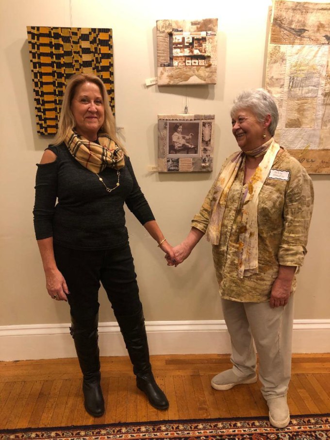Has it ever been a busy, hectic year! It’s been non-stop since I began work on OURstory: Human Rights Stories in Fabric last December, which we still haven’t been able to show you, although it’s been getting some good press at the International Quilt Festival at the George R. Brown Convention Center in Houston. Then, on to March when the activity started for the Explorations Exhibit which will finally culminate in April. As soon as that was finished I immersed myself in the reorganization of The Gallery, which we are still awaiting final word on. Meanwhile our critique group, Stitched Connections has had two exhibitions, one at the Andover Library and the current one at Beebe Estate, which will continue through this month. The Melrose cable channel videotaped us at the Beebe Estate last Friday evening and the photographer took a wonderful photo of my sister, Marie and I with some of my Family Stories quilts behind us.