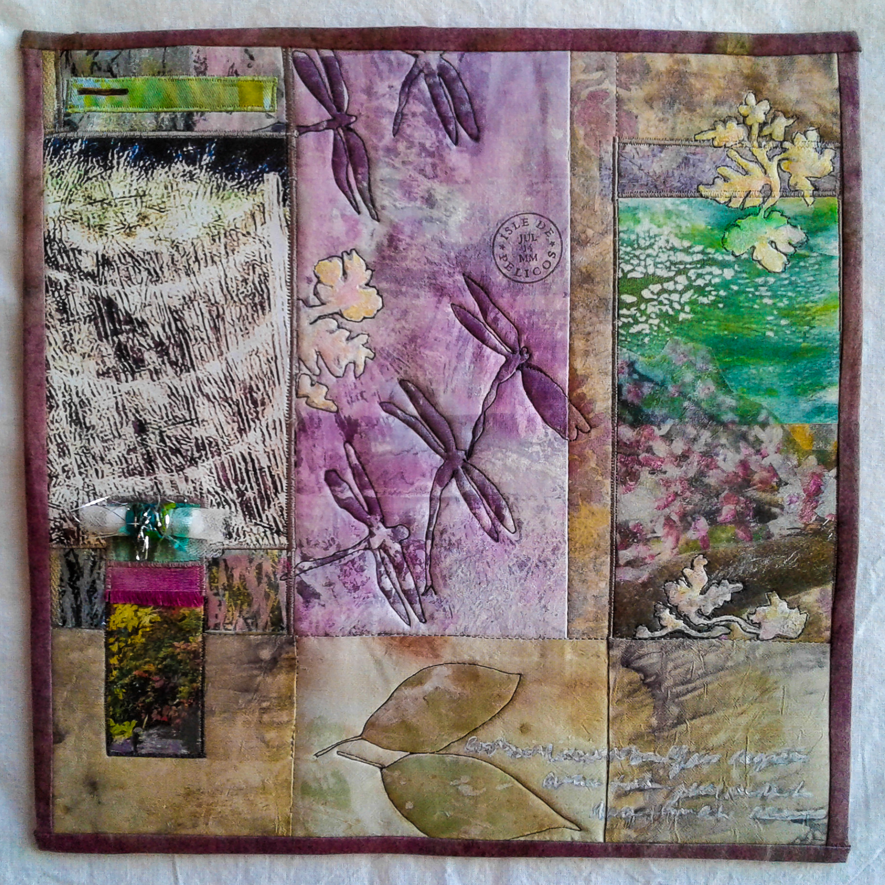 The foundation consists of machine pieced ecoprints on various fabrics to which I layered fused sections of ecoprints and digitally altered photos on fabrics – some partially handpainted. I stenciled dragonflies and printed a handcarved softblock with acrylic paint with added painted touches. One commercial stamp is used and I added some asemic writing with acrylic ink. Free motion stitching emphasizes line and adds to the value contrast. The last touch was to add a “prayer bundle” that was made in the very beginning to appeal to the Muses for inspiration for my ideas to take flight.
