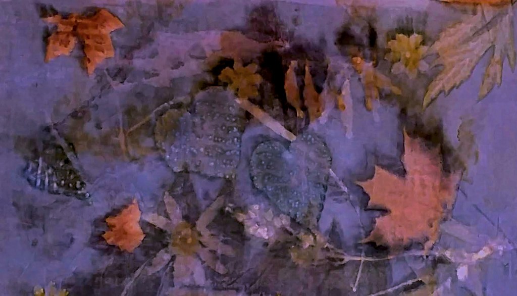 I ecoprinted some cloth with sweet potato leaves and here’s one of the pics: